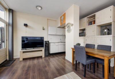 Entree appartement. Hal met trap naar de tweede verdieping, garderobe en toilet met fonteintje. De woonkamer is heerlijk licht door de vele grote ramen. In de woonkamer is er een deur naar het terras op deze verdieping. De eenvoudige keuken bevindt zich in de hoek van de woonkamer en is voorzien van de volgende apparatuur: gaskookplaat, afzuigkap en koelkast.