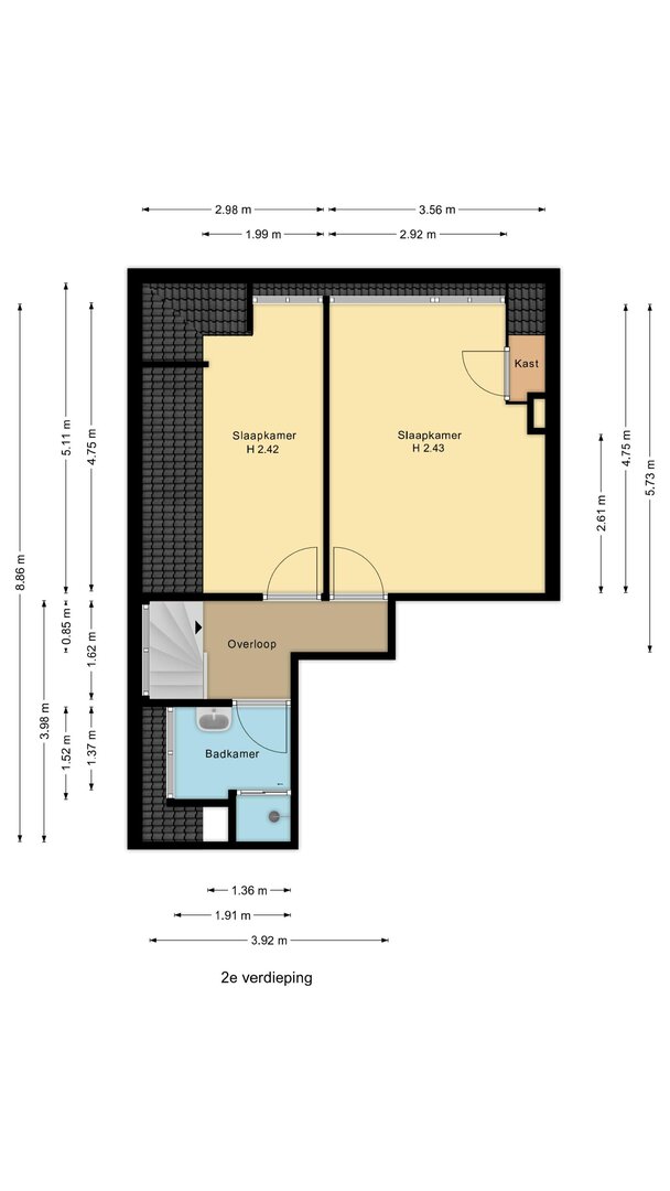 De tweede verdieping heeft nog eens twee slaapkamers en een badkamer met douche en wastafel. Dankzij de dakkapel aan de zijkant is het trappengat hier licht en ruimtelijk, wat de verdieping een prettige uitstraling geeft.
