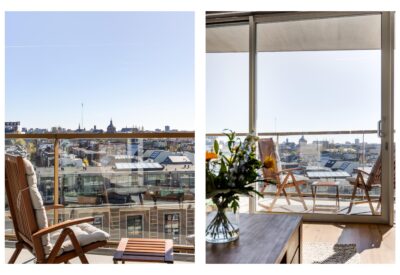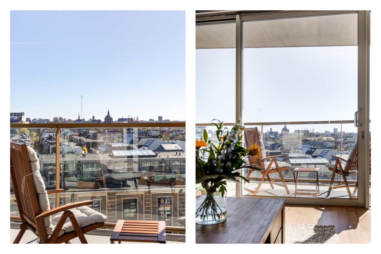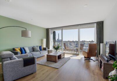 At the end of the hallway, a door leads to the open kitchen, which is centrally positioned within the living space. The living room is located on the balcony side and features a large floor-to-ceiling window with sliding doors, offering breathtaking views over Leiden. In summer, opening the sliding doors creates a seamless connection between inside and outside, effectively extending the living space.