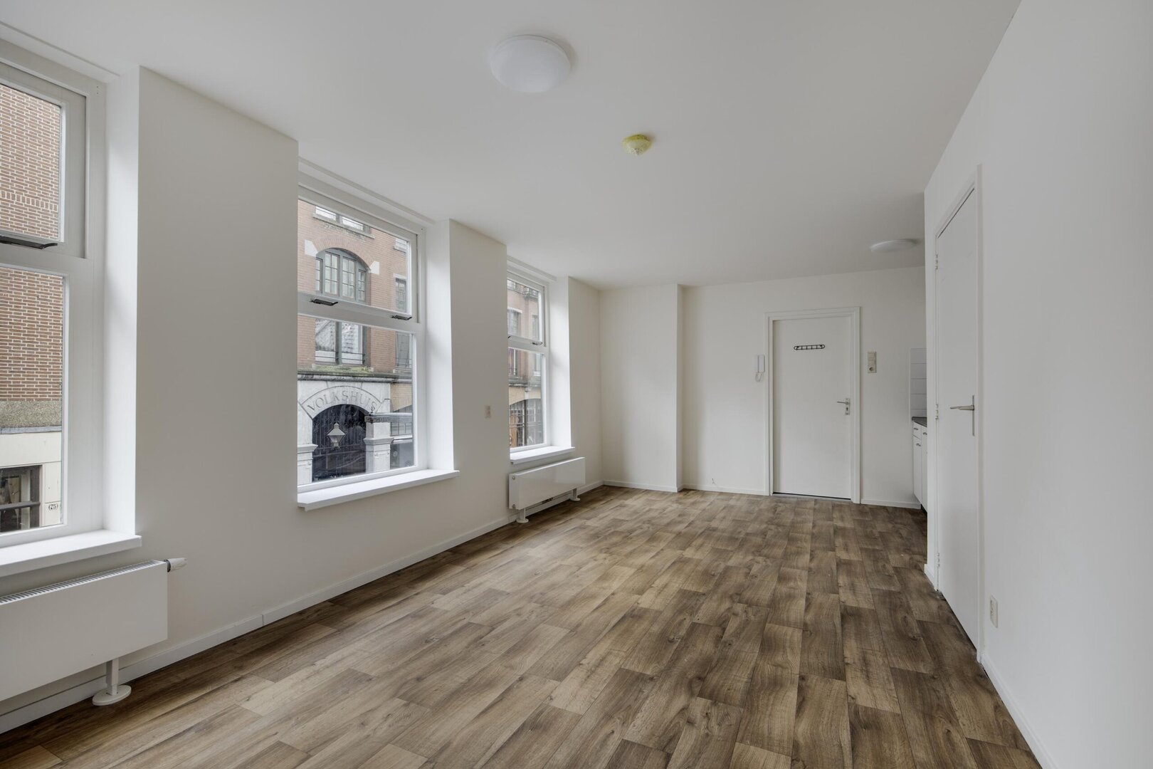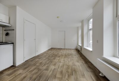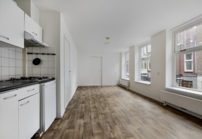 Landing with built-in cupboard housing the hybrid central heating boiler. Entrance to the apartment with access to the living room, offering views over Haarlemmerstraat and the Volkshuis building. This room also contains the kitchen in a straight layout, equipped with a gas hob, extractor hood and refrigerator.