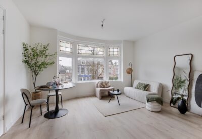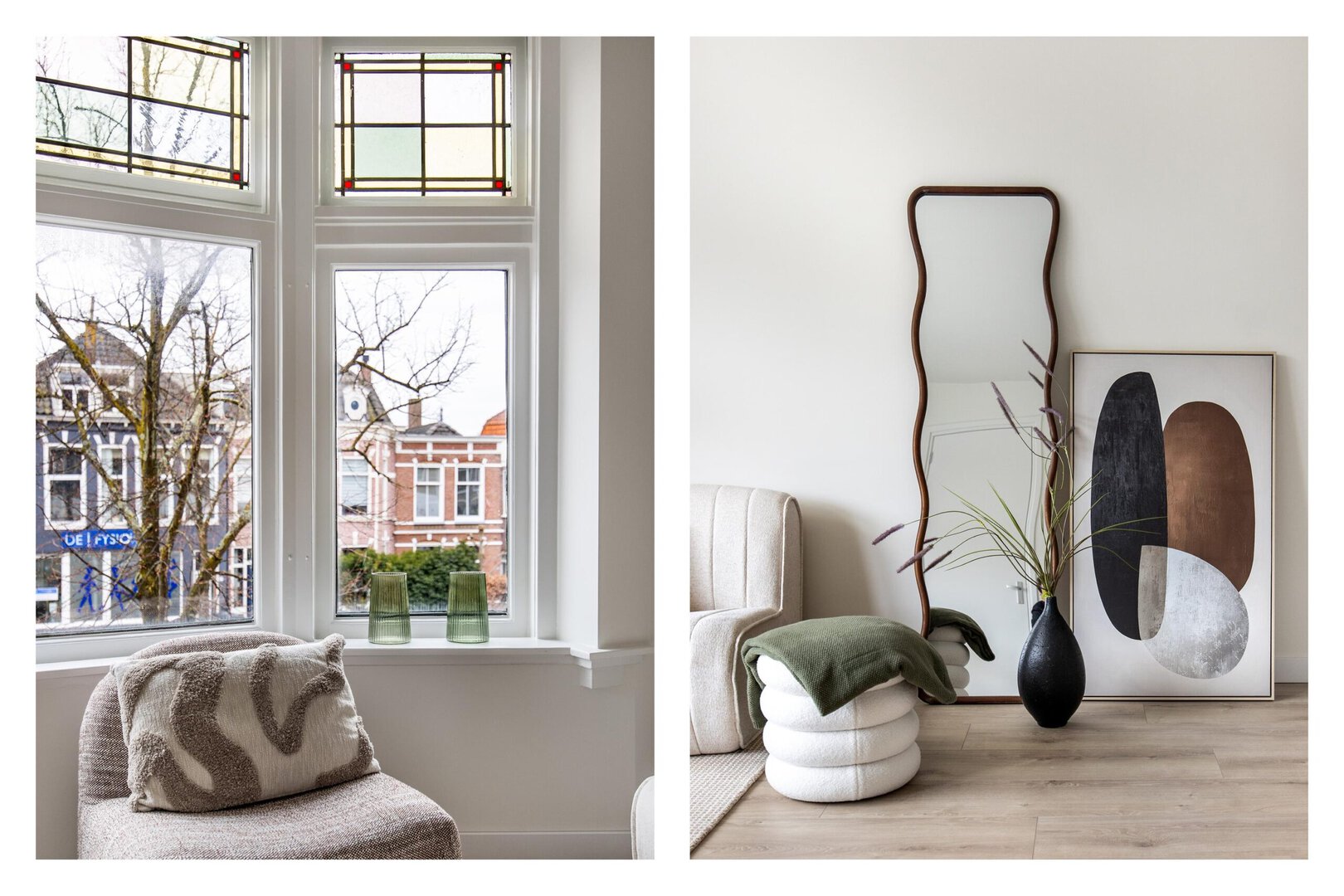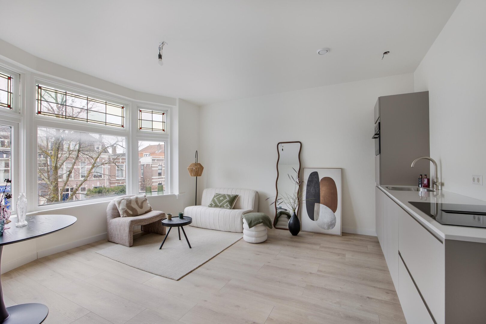 Via het verzorgde trappenhuis bereik je de entree van de woning op de eerste verdieping. Je komt direct binnen in de lichte woonkamer met open keuken. Dankzij de gunstige ligging op het zuiden en de karakteristieke erker met glas-in-loodramen (voorzien van dubbel glas) geniet je hier van veel natuurlijk licht en een sfeervolle uitstraling.