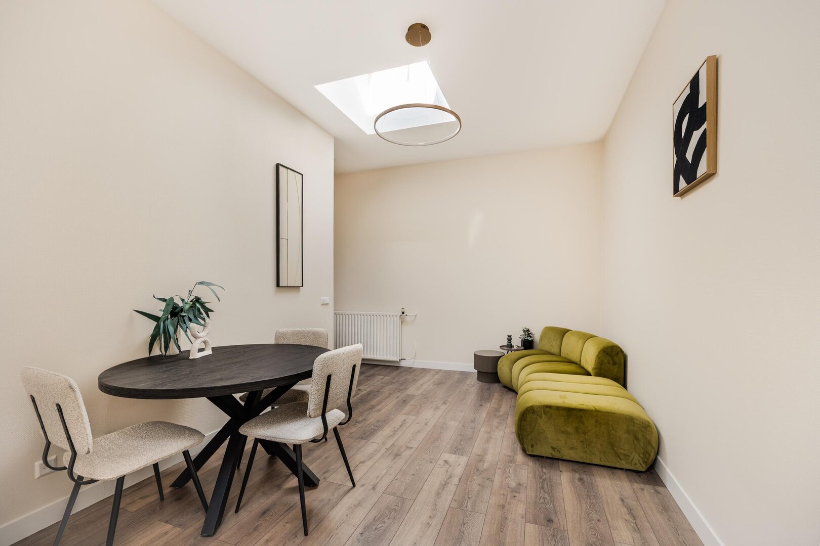 Via de gezamenlijke entree stap je de hal binnen, die toegang geeft tot de lichte woonkamer met open keuken. De hoge plafonds met dakramen zorgen voor een prettige hoeveelheid daglicht. De keuken is voorzien van een nieuwe oven, 4-pits gasfornuis en afzuigkap. De wanden zijn strak gestuct en geschilderd, en door de hele woning ligt een nieuwe laminaatvloer.