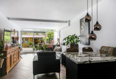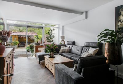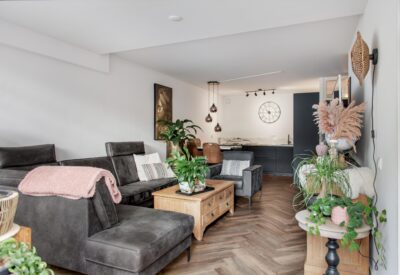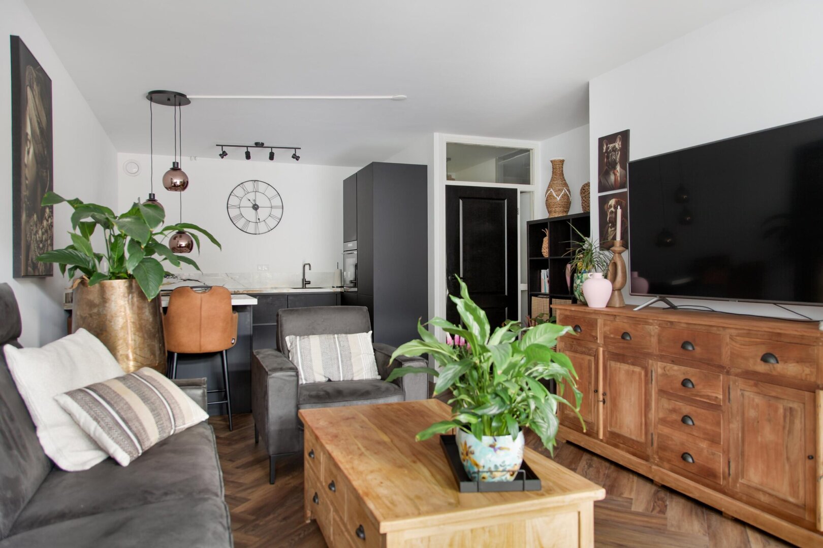 De woonkamer is een lichte en sfeervolle leefruimte, voorzien van een moderne visgraat pvc-vloer. De open keuken is in 2024 luxe vernieuwd en uitgevoerd met een bar en diverse hoogwaardige inbouwapparaten: een Bora-inductiekookplaat met geïntegreerde afzuiging, combi-oven, koelkast en vaatwasser.