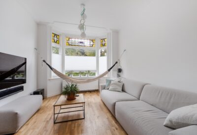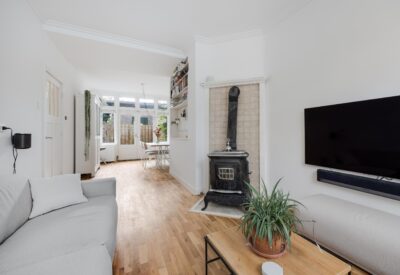 Bij binnenkomst valt direct de originele granito vloer op. Vanuit de hal zijn alle ruimtes bereikbaar: de woonkamer, keuken, badkamer, toilet en slaapkamer. De woonkamer heeft hoge plafonds, strak gestucte muren en openslaande deuren naar de achtertuin. De houten vloer en houtkachel geven de ruimte karakter en een warme uitstraling. In de voormalige en-suite is een handige opbergkast gerealiseerd – praktisch, zonder dat het de charme van de kamer verstoort.