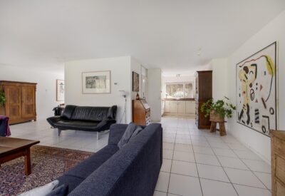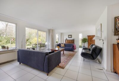 The living room is wonderfully bright and generously proportioned, offering many layout possibilities. The large windows and sliding doors at the rear provide not only abundant natural light but also beautiful views over the garden. The living room also features a small wood-burning stove.