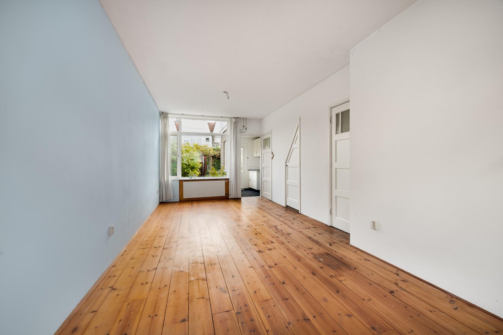 Entree van de woning, gang met meterkast, toilet en toegang tot de woonkamer. Vanuit de lichte doorzonwoonkamer is er toegang tot de keuken en de eerste verdieping via een gesloten trap met trapkast. De keuken is eenvoudig, maar desgewenst bruikbaar.