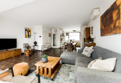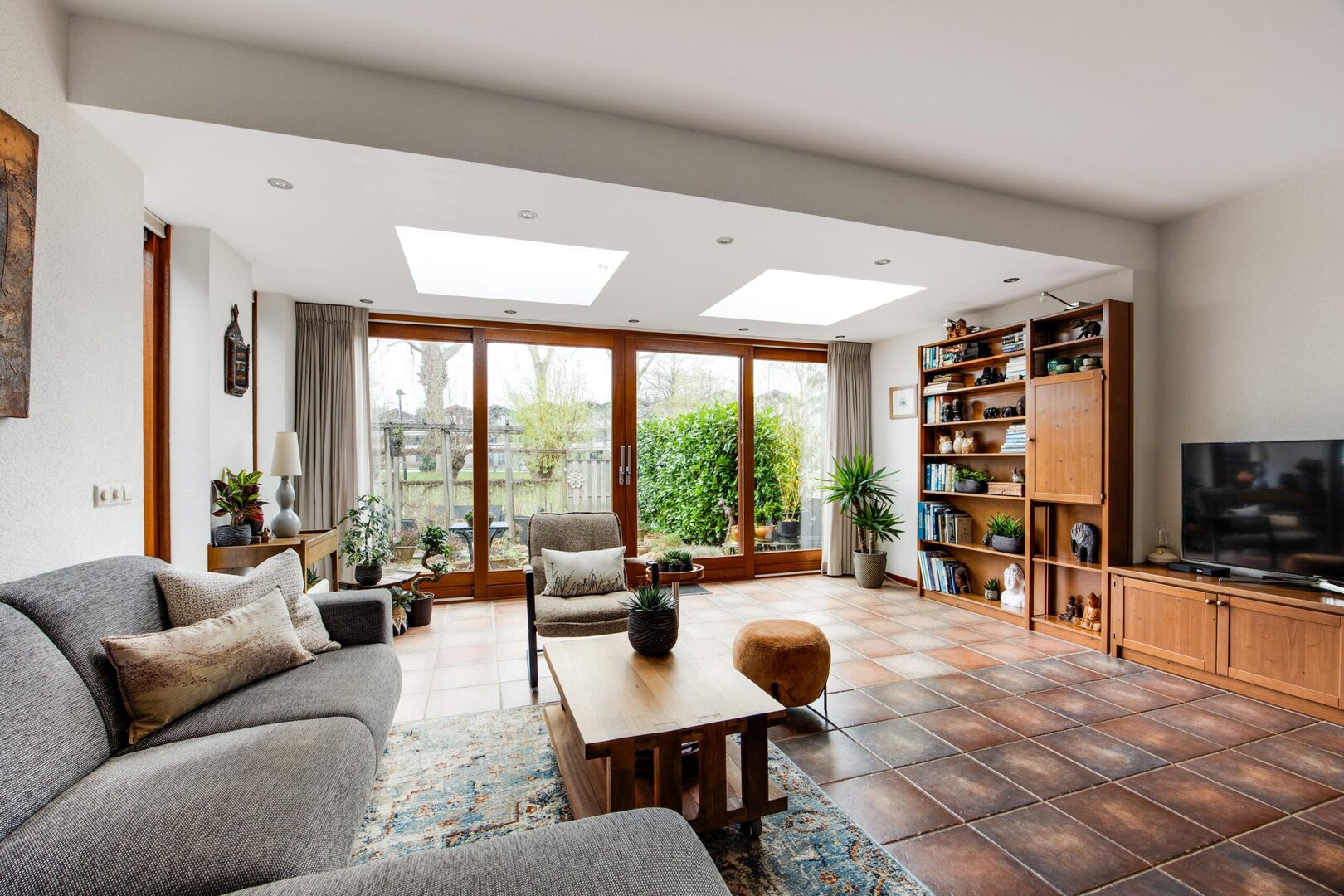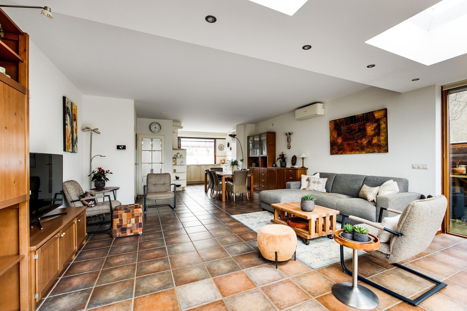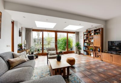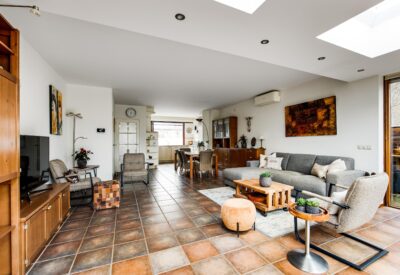 Entrance into a spacious hallway with wardrobe area, meter cupboard and toilet. The bright living room was extended at the rear in 2005 and features tiled flooring with underfloor heating and several skylights, creating beautiful natural light. The living room is also equipped with air conditioning for both cooling and heating. At the front of the house is the kitchen, fitted with a microwave, oven, dishwasher, refrigerator, freezer, four-burner hob and extractor hood.