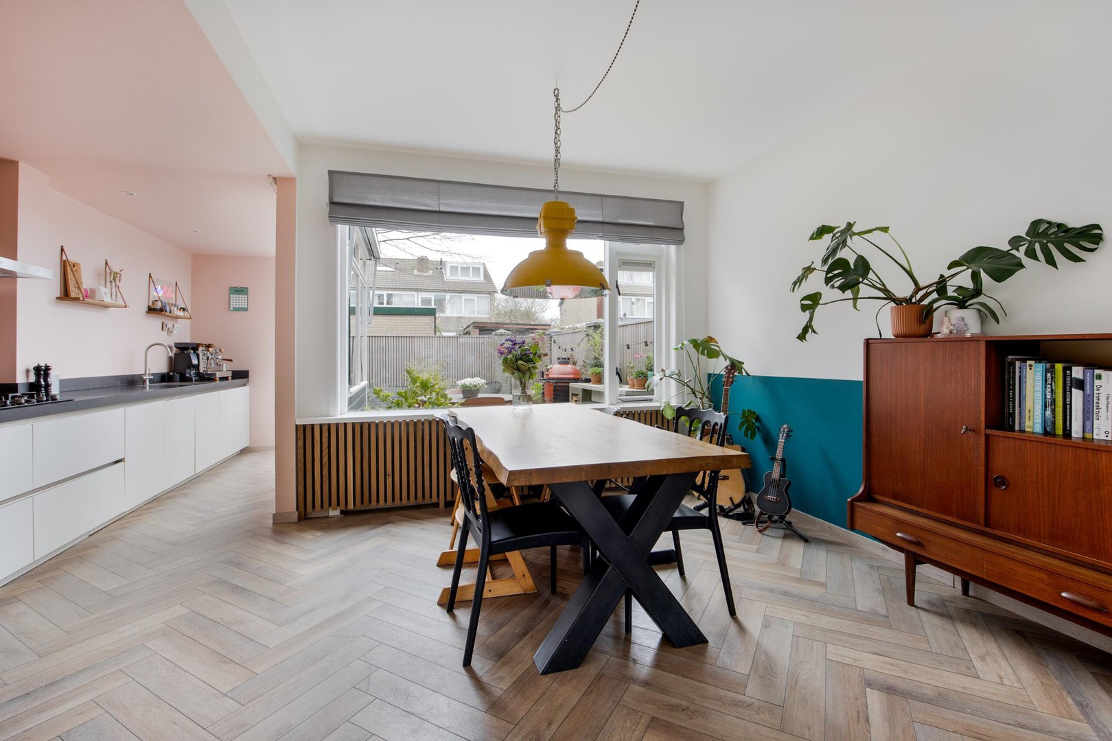 The living room is wonderfully bright thanks to the large windows and the charming bay window at the front. The insulated herringbone PVC floor gives the space a luxurious and warm appearance.