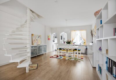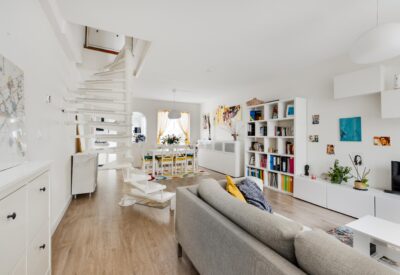At the rear, a dormer extension with a synthetic frame has been added, the first-floor windows have been fitted with triple glazing, and a new central heating boiler has been installed. The roof has been cleaned and insulated, the roofing of the rear extension beneath the roof terrace has been renewed, and the ground floor has been replaced and insulated. The bathroom (2022) and the toilet with laundry space on the ground floor have also been modernised.