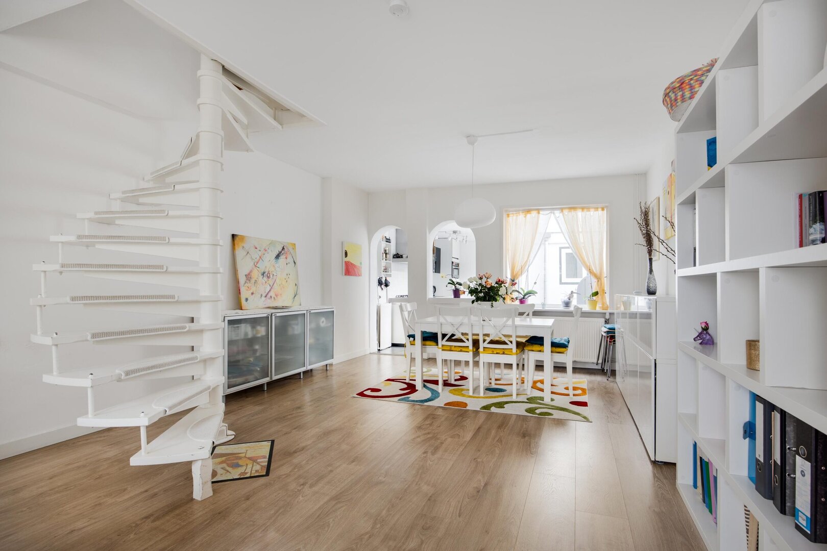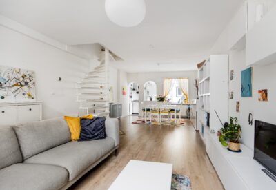The living room is bright and spacious, with a cosy sitting area at the front and space for a dining table at the rear. The semi-open kitchen connects seamlessly and is equipped with a dishwasher, fridge-freezer, oven, and a four-burner gas stove with extractor hood. From the kitchen, you have access to the compact rear garden and the extended toilet/laundry area.
