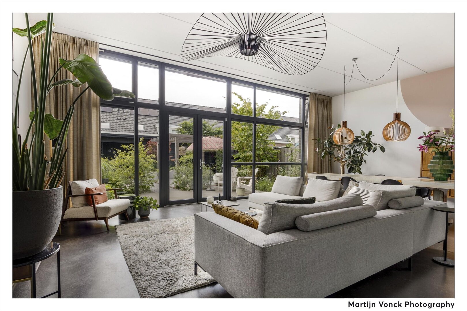 Lush greenery throughout the garden creates cozy nooks and seating areas. At the center is a pergola with space for a large outdoor dining table. At the far end of the garden is a stylish covered lounge area, which can be enclosed with a glass sliding wall. Next to this is a spacious wooden shed, equipped with electricity and a rear entrance.