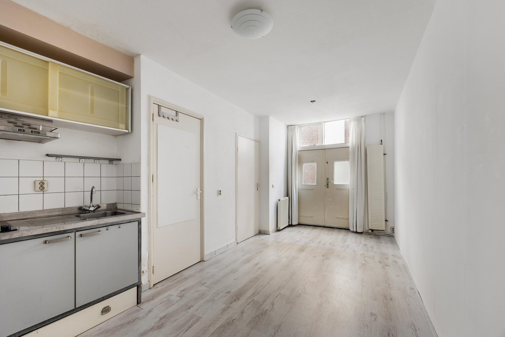 Op de begane grond bevindt zich de entree met meterkast en toegang tot de eerste kamer. Deze ruimte heeft een keukenblok, een eigen badkamer met inloopdouche, toilet, wastafel en handdoekradiator, en openslaande deuren naar de steeg.