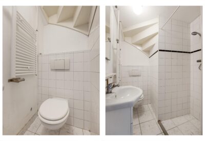 De tweede verdieping is de ruimste etage en beschikt over twee dakkapellen, een keukenblok en een badkamer met douche, toilet, wastafel en handdoekradiator. Hier bevinden zich ook de cv-ketel en de elektrische boiler.