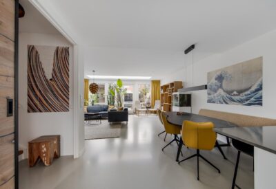 The living room is located at the rear, has been extended and features a large 4-metre-long skylight that floods the space with natural light. From the living room, there is a view of the rear garden, which is accessible via French doors fitted with Luxaflex insect screens. The entire ground floor has a cast floor with underfloor heating. All front-facing windows are fitted with shutters.
