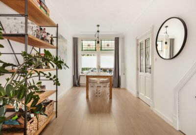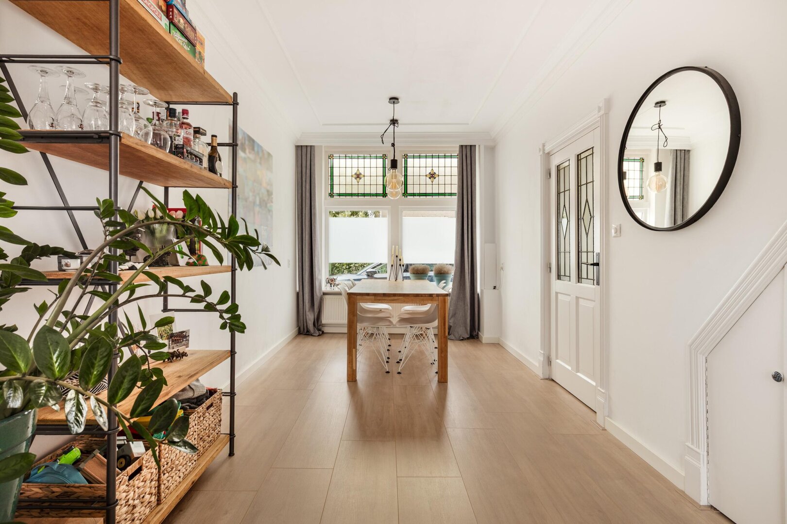 Entree van de woning, hal met meterkast, met 3 aardlekschakelaars en een 3-fasen hoofdschakelaar. Vanuit de hal is de woonkamer te betreden. Deze is heerlijk licht door de grote ramen aan voor- en achterzijde. De ramen aan de voorzijde hebben tevens nog originele glas-in-lood ramen. De woonkamer voelt ruim aan en er bevindt zich ook een handige trapkast voor extra opbergruimte.