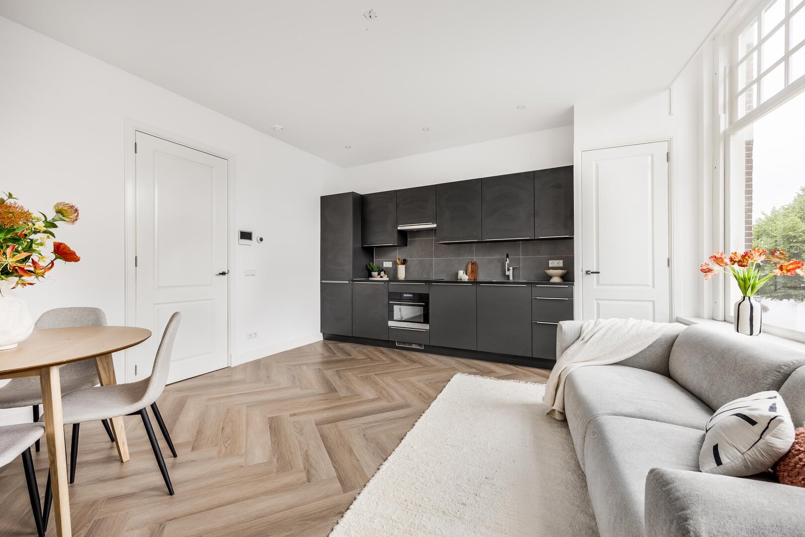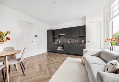 Entree appartement. Gang met toegang tot alle vertrekken. Aan de voorzijde de woonkamer met twee grote ramen. De keuken staat langs de muur en heeft een rechte opstelling. De keuken is voorzien van de volgende inbouwapparatuur: koelkast, vriezer, vaatwasser, ingebouwde wasmachine, kookplaat, afzuigkap en een combi-oven. Naast de keuken is er nog een vaste kast met daarin de groepenkast.