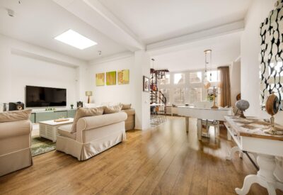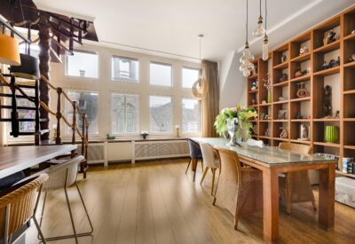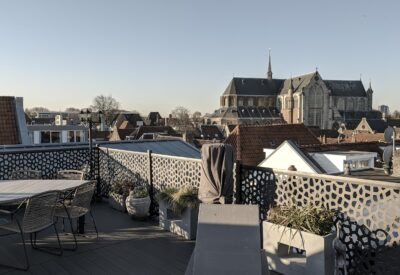 Een open houten wenteltrap in de woonkamer leidt naar de bovenste verdieping met een vierde kamer, ideaal als slaapkamer of werkruimte en toegang tot het riante dakterras van 39 vierkante meter. De ruimte heeft een prachtige houten vloer en een karakteristiek balkenplafond dat de historie van het pand benadrukt. Het terras is een fantastische plek om te genieten van zon en weidse uitzichten over de stad.