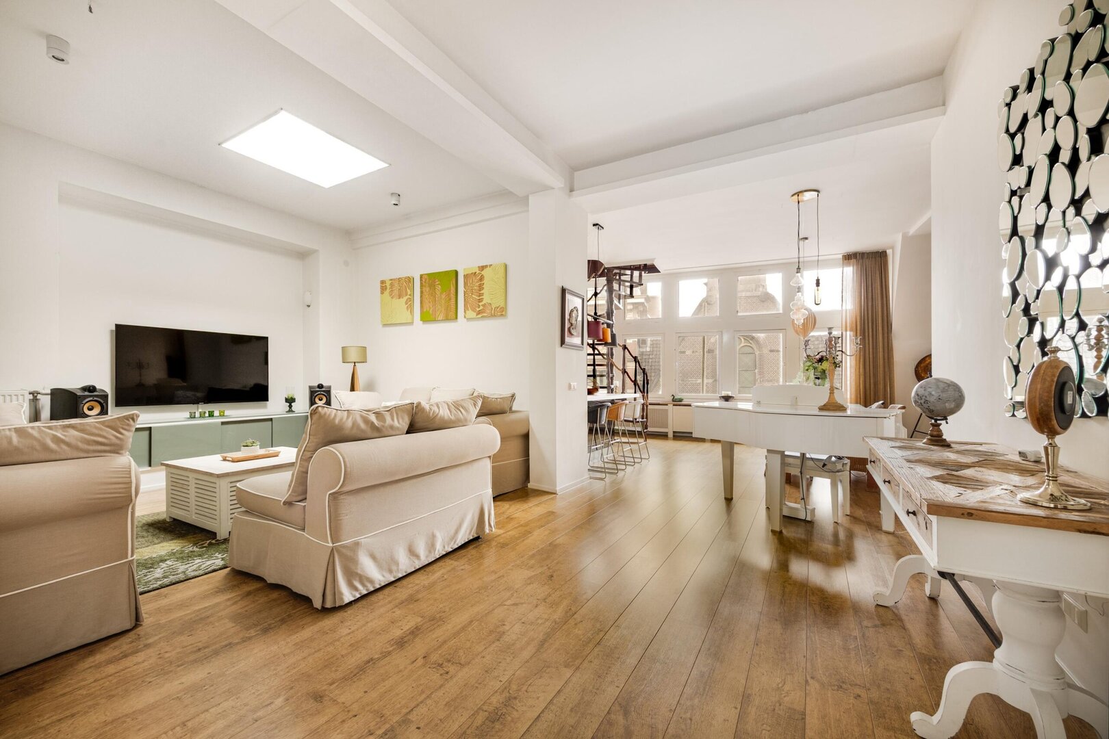 Een open houten wenteltrap in de woonkamer leidt naar de bovenste verdieping met een vierde kamer, ideaal als slaapkamer of werkruimte en toegang tot het riante dakterras van 39 vierkante meter. De ruimte heeft een prachtige houten vloer en een karakteristiek balkenplafond dat de historie van het pand benadrukt. Het terras is een fantastische plek om te genieten van zon en weidse uitzichten over de stad.